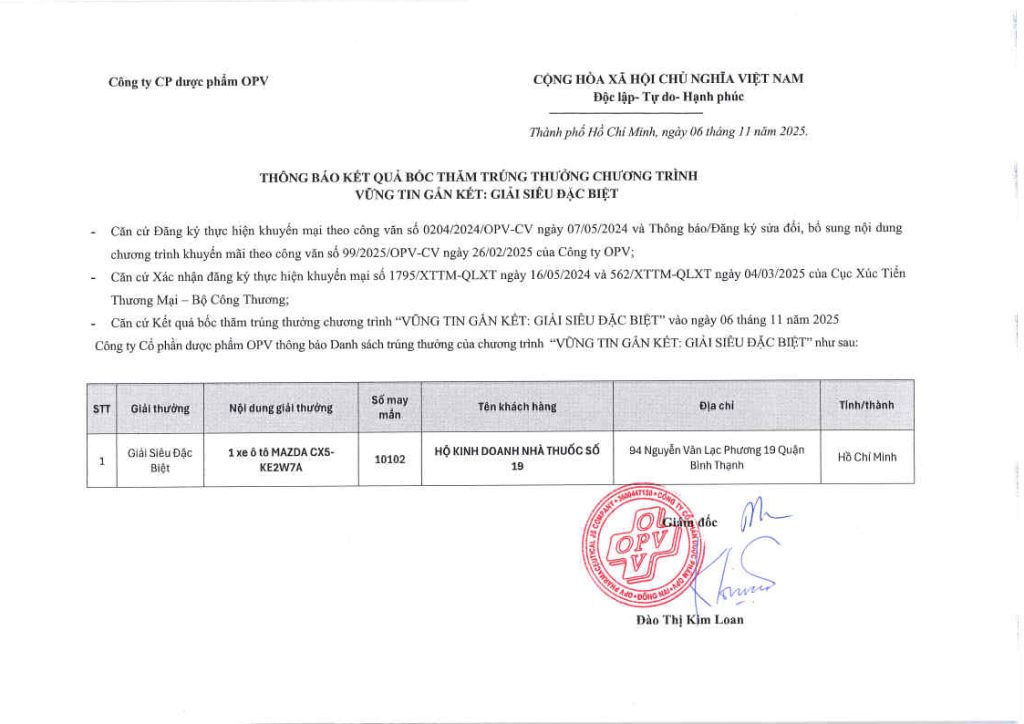 Công ty Cổ phần dược phẩm OPV thông báo Danh sách trúng thưởng của chương trình “VỮNG TIN GẮN KẾT: GIẢI SIÊU ĐẶC BIỆT” như sau: